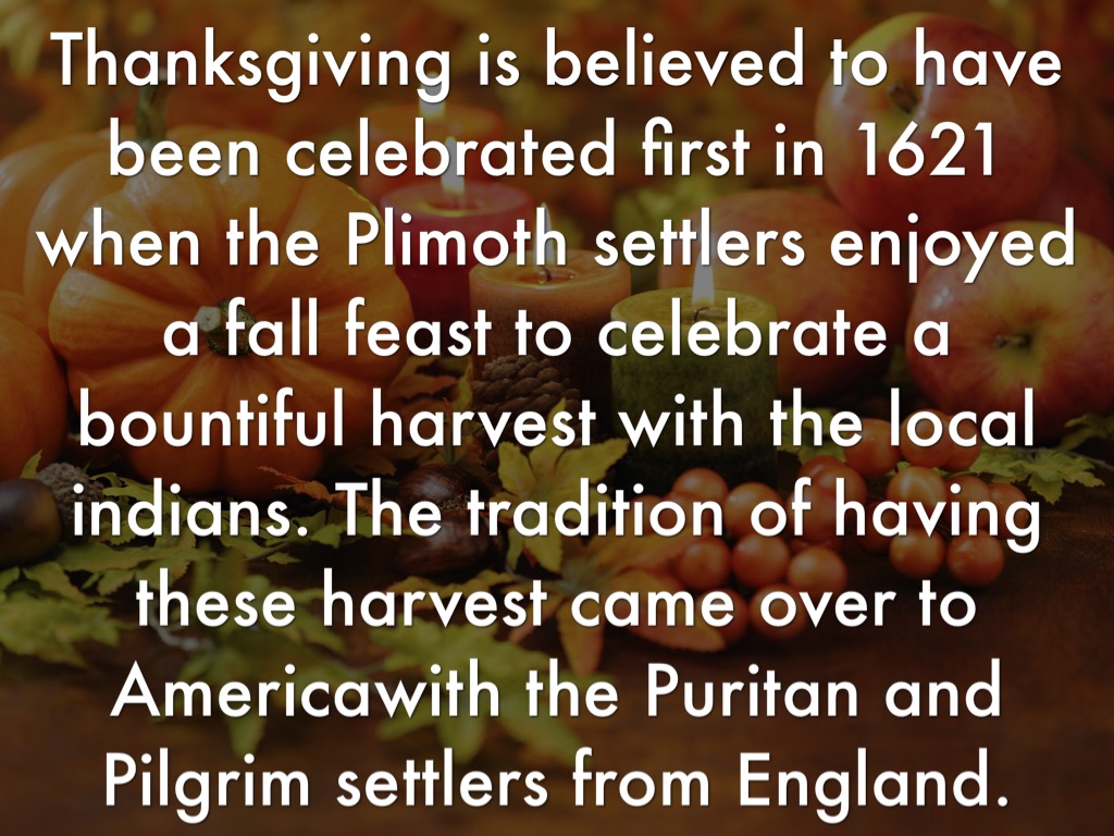 Thanksgiving is believed to have been celebrated first in 1621 when the Plimoth settlers enjoyed a fall feast to celebrate a bountiful harvest with the local indians. The tradition of having these harvest came over to Americawith the Puritan and Pilgrim settlers from England.