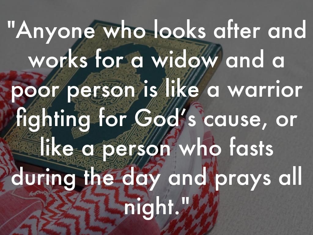 "Anyone who looks after and works for a widow and a poor person is like a warrior fighting for God’s cause, or like a person who fasts during the day and prays all night."