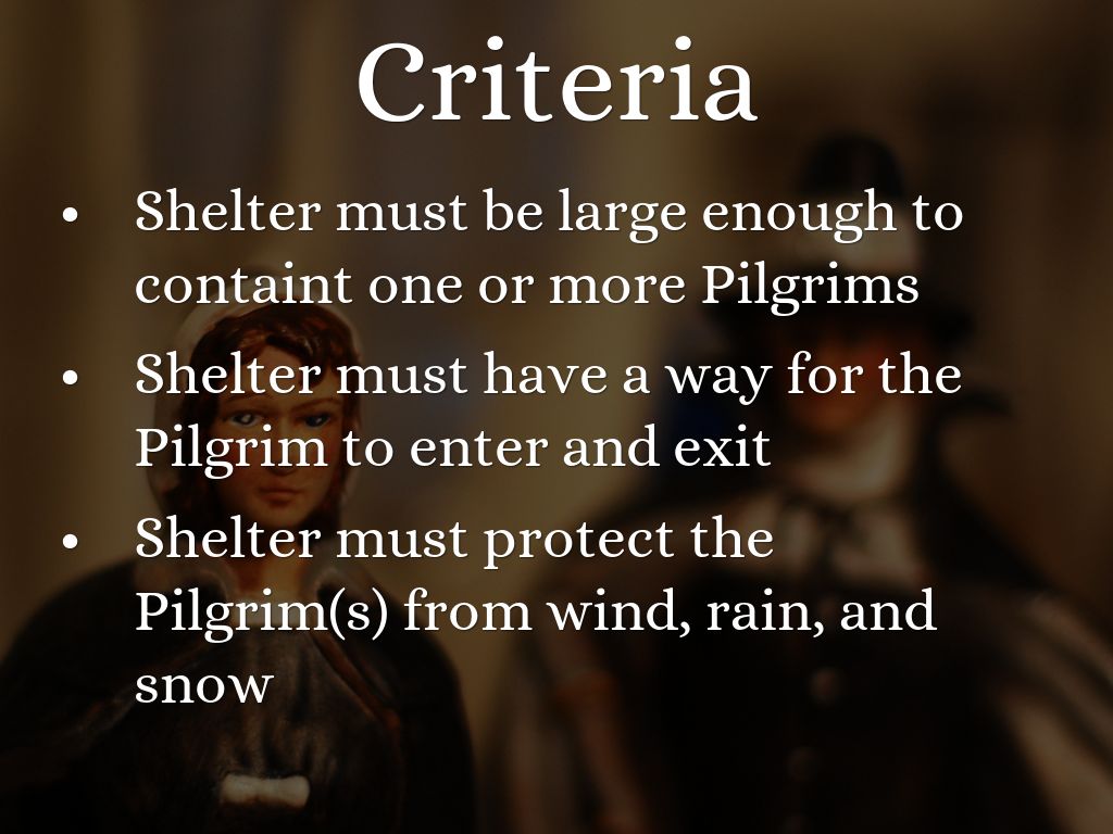 • Shelter must protect the Pilgrim(s) from wind, rain, and snow
