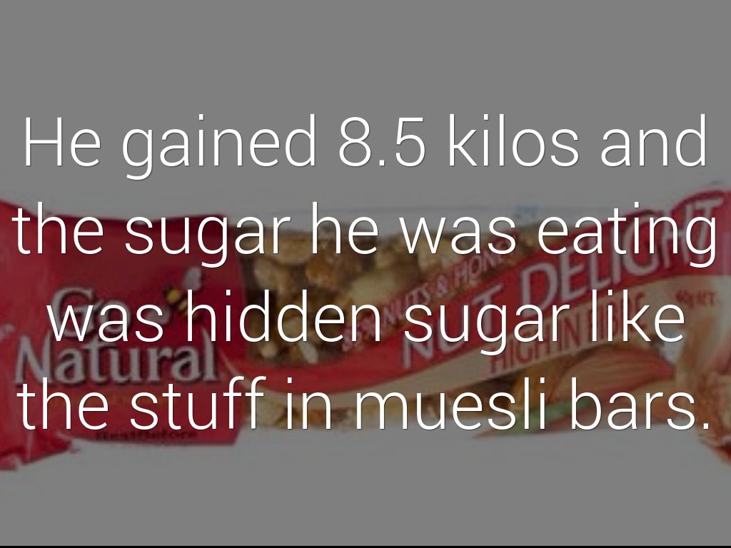 He gained 8.5 kilos and the sugar he was eating was hidden sugar like the stuff in muesli bars.