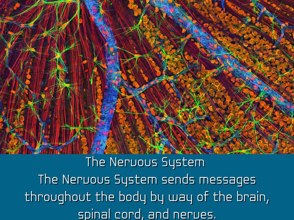 The Nervous System sends messages throughout the body by way of the brain, spinal cord, and nerves.