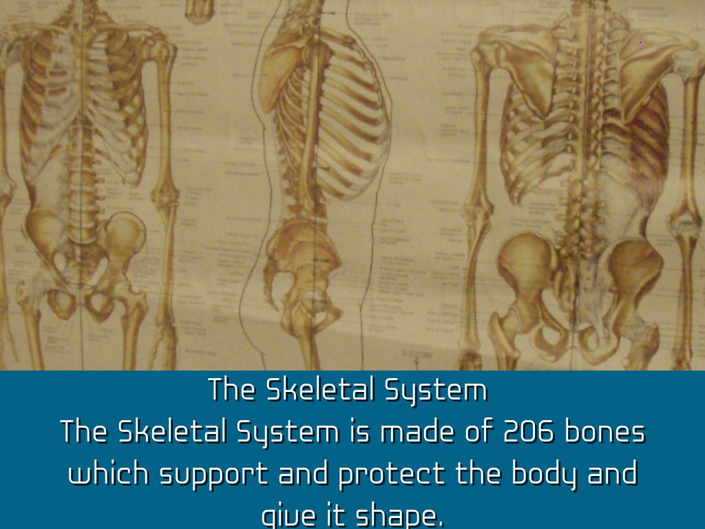 The Skeletal System is made of 206 bones which support and protect the body and give it shape.