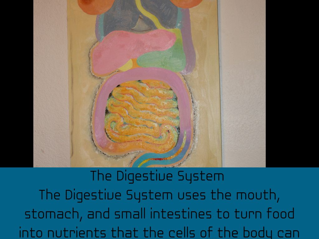 The Digestive System uses the mouth, stomach, and small intestines to turn food into nutrients that the cells of the body can use.