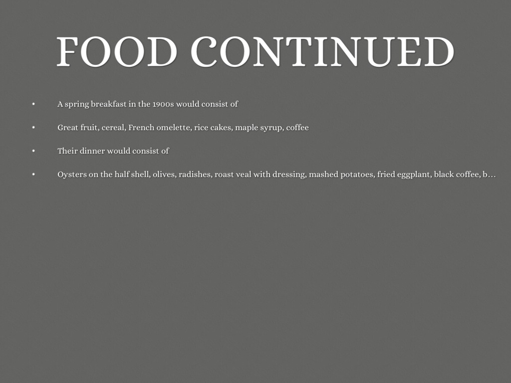 Oysters on the half shell, olives, radishes, roast veal with dressing, mashed potatoes, fried eggplant, black coffee, baked beans salad, and deviled eggs with wheat bread