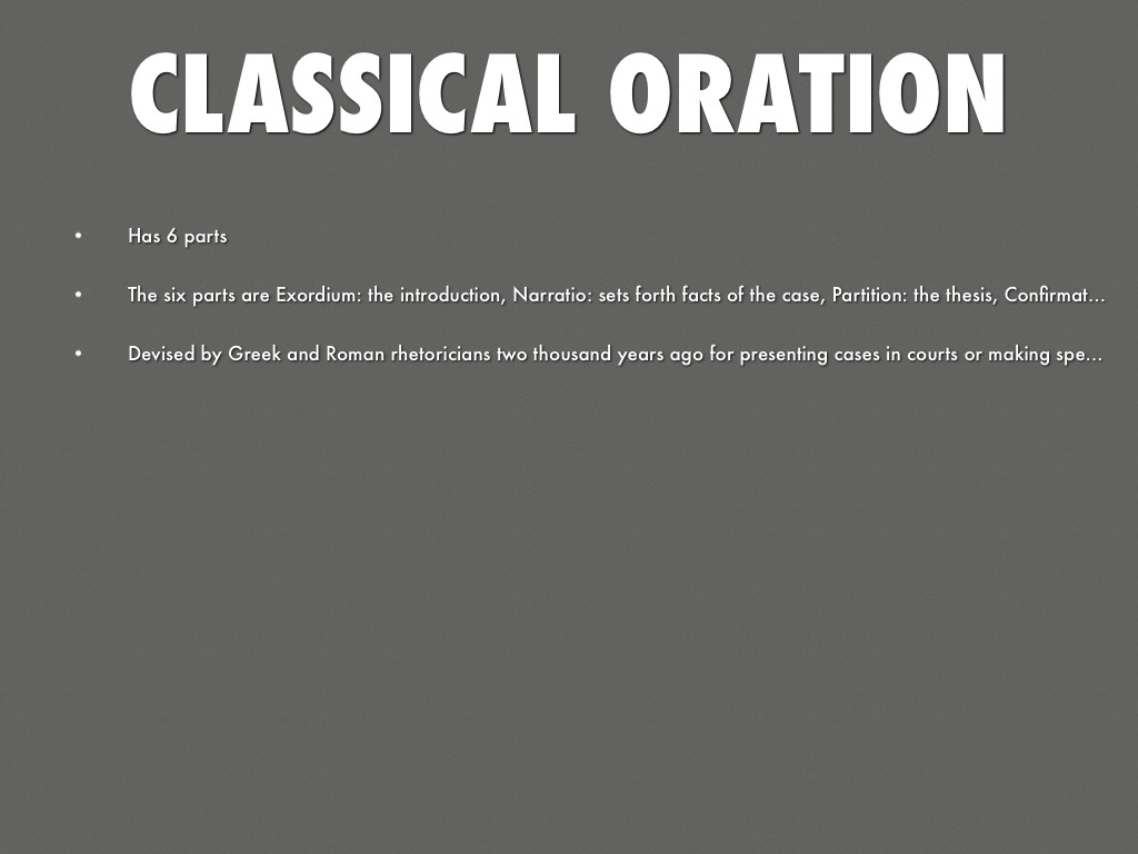 The six parts are Exordium: the introduction, Narratio: sets forth facts of the case, Partition: the thesis, Confirmatio: Writer lays out and supports arguments, Refutatio: Writer looks at counter arguments and demonstrates why they aren't compelling, Peroratio: Conclusion/resolution of paper