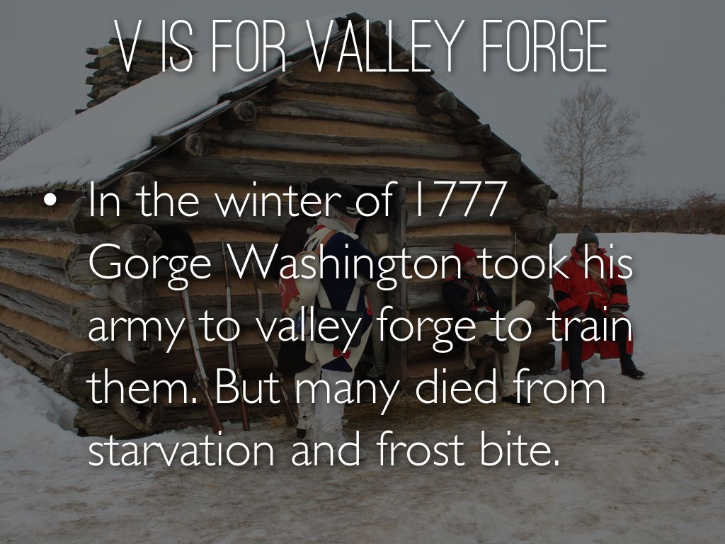 In the winter of 1777 Gorge Washington took his army to valley forge to train them. But many died from starvation and frost bite.