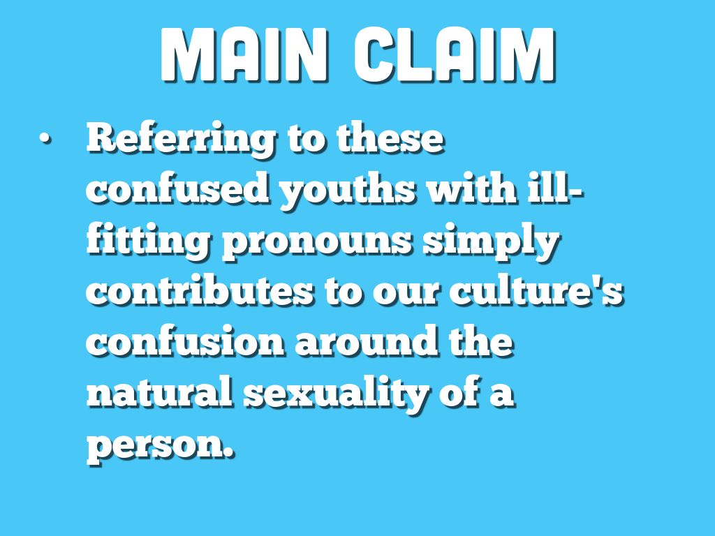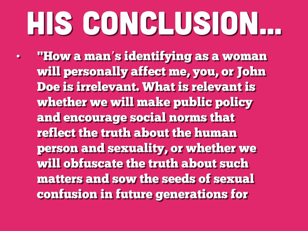 "How a man’s identifying as a woman will personally affect me, you, or John Doe is irrelevant. What is relevant is whether we will make public policy and encourage social norms that reflect the truth about the human person and sexuality, or whether we will obfuscate the truth about such matters and sow the seeds of sexual confusion in future generations for years to come."