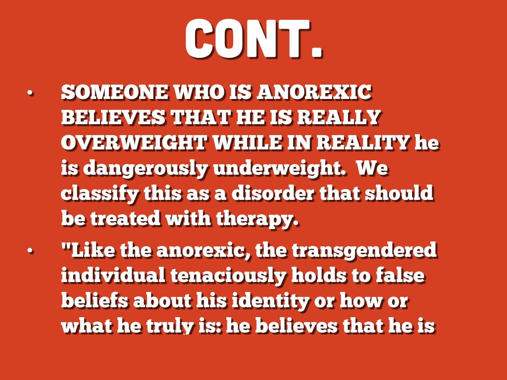 "Like the anorexic, the transgendered individual tenaciously holds to false beliefs about his identity or how or what he truly is: he believes that he is a sex that he is not"