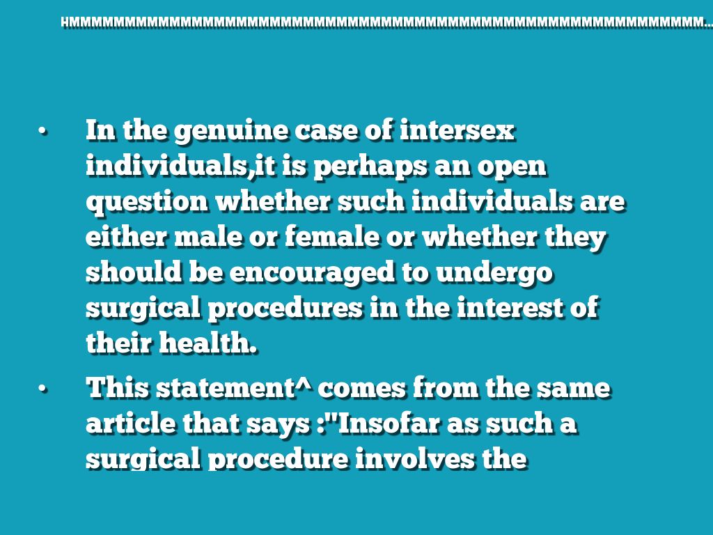 In the genuine case of intersex individuals,it is perhaps an open question whether such individuals are either male or female or whether they should be encouraged to undergo surgical procedures in the interest of their health.