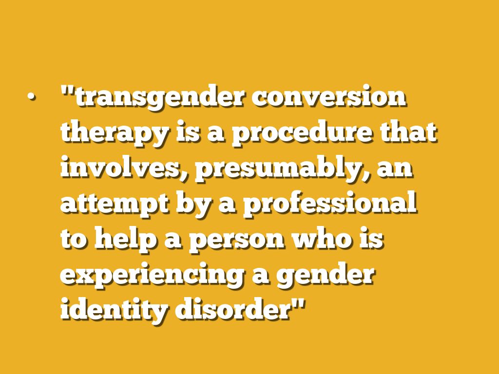 "transgender conversion therapy is a procedure that involves, presumably, an attempt by a professional to help a person who is experiencing a gender identity disorder"