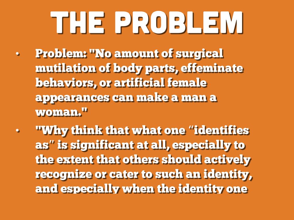 Problem: "No amount of surgical mutilation of body parts, effeminate behaviors, or artificial female appearances can make a man a woman."
