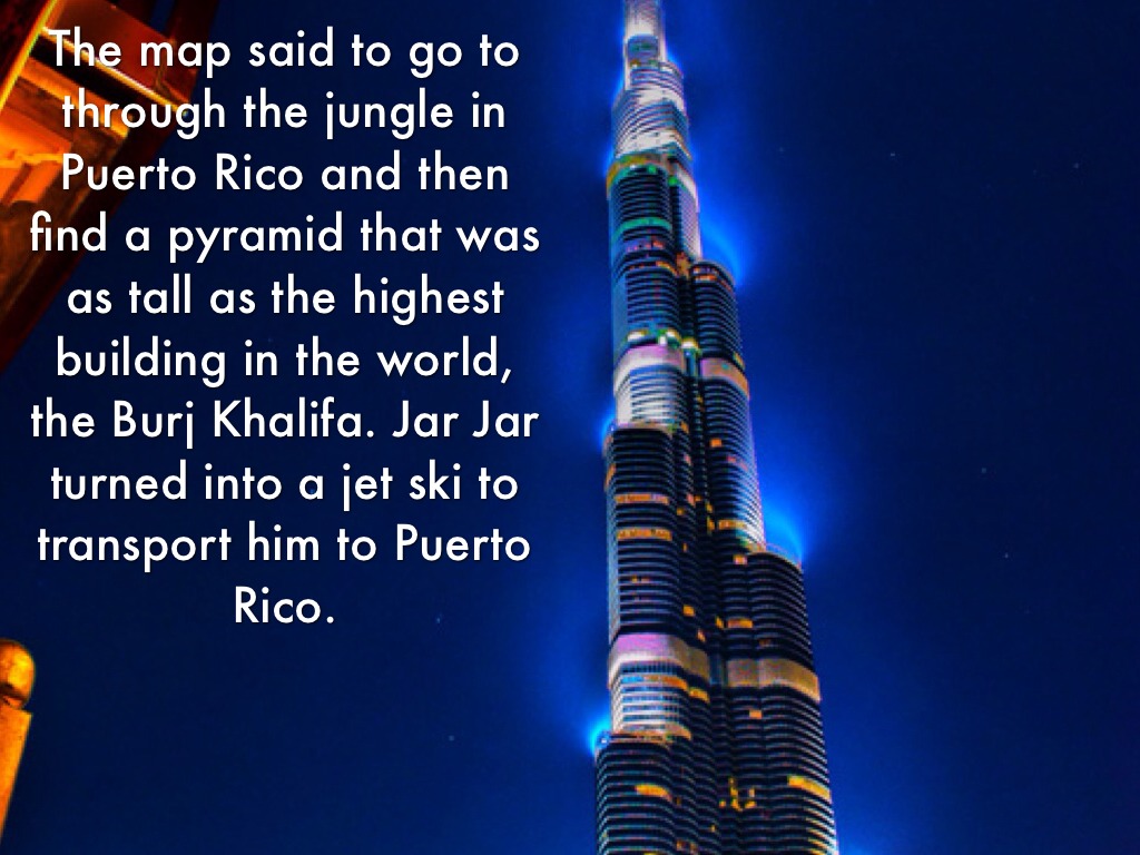 The map said to go to through the jungle in Puerto Rico and then find a pyramid that was as tall as the highest building in the world, the Burj Khalifa. Jar Jar turned into a jet ski to transport him to Puerto Rico.