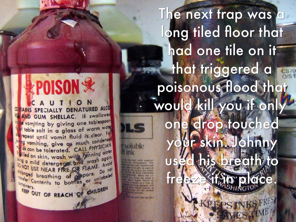 The next trap was a long tiled floor that had one tile on it that triggered a poisonous flood that would kill you if only one drop touched your skin. Johnny used his breath to freeze it in place.