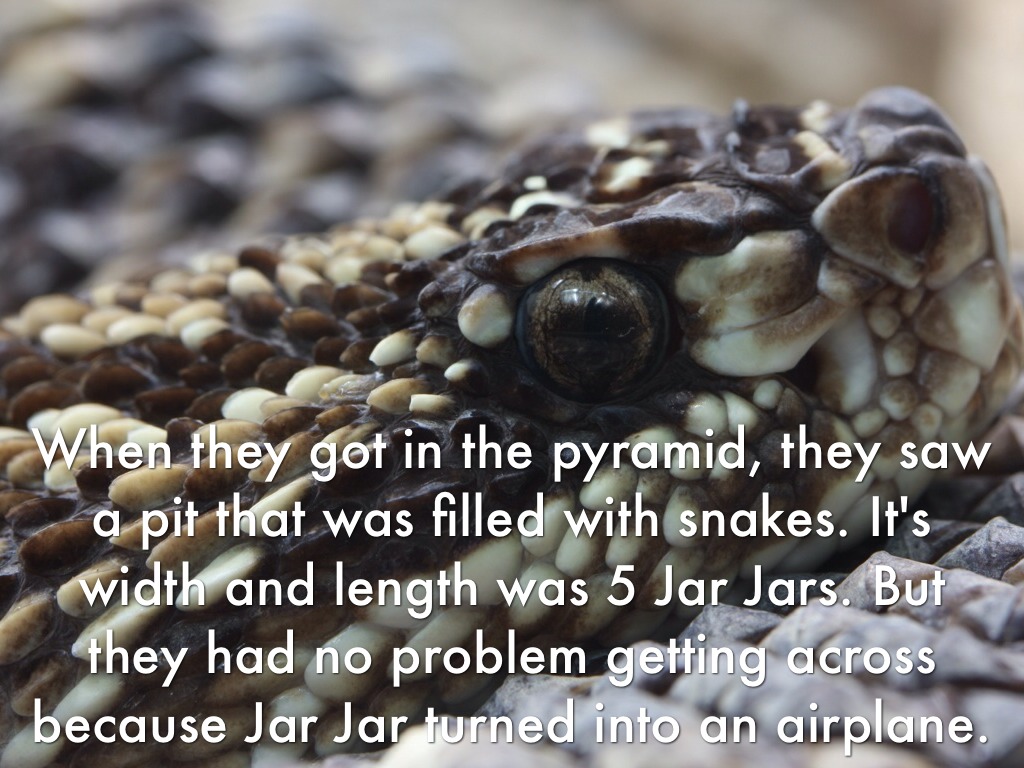 When they got in the pyramid, they saw a pit that was filled with snakes. It's width and length was 5 Jar Jars. But they had no problem getting across because Jar Jar turned into an airplane.