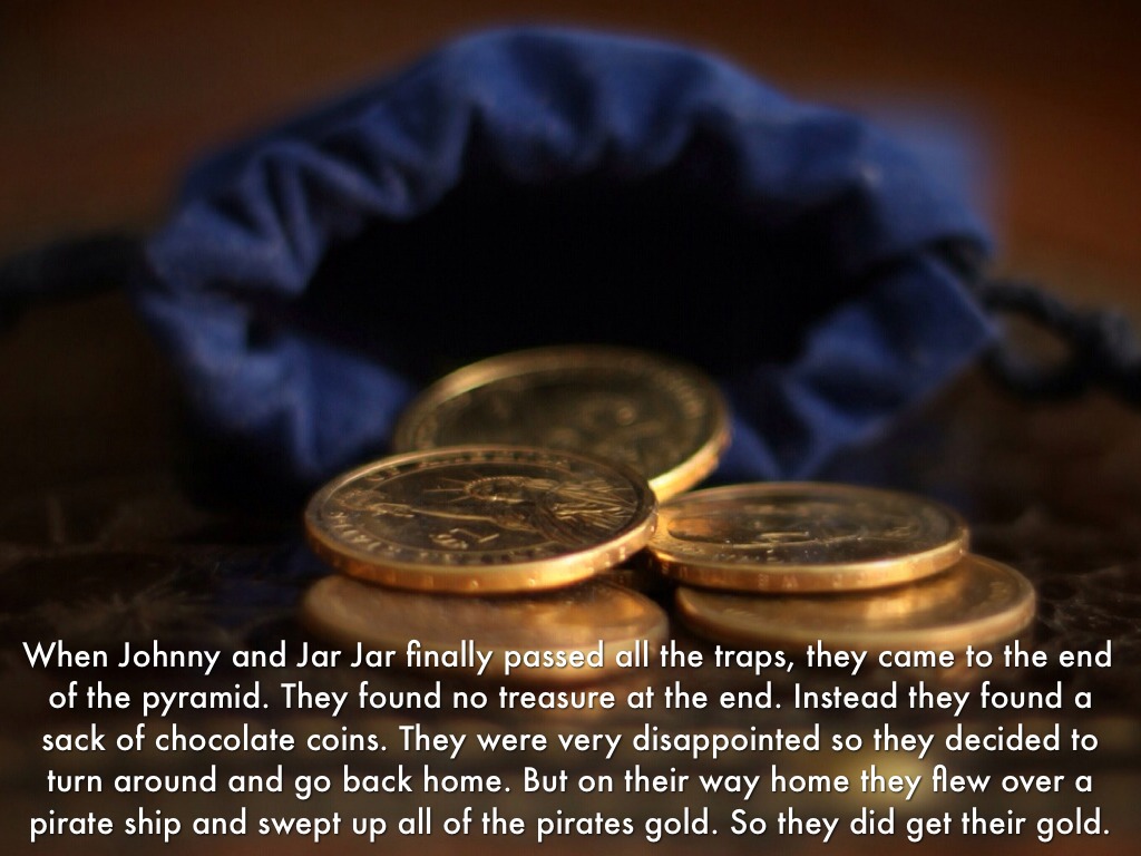 When Johnny and Jar Jar finally passed all the traps, they came to the end of the pyramid. They found no treasure at the end. Instead they found a sack of chocolate coins. They were very disappointed so they decided to turn around and go back home. But on their way home they flew over a pirate ship and swept up all of the pirates gold. So they did get their gold.