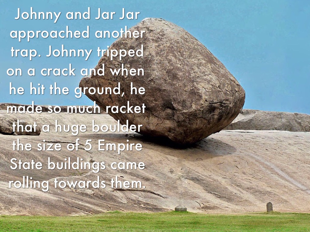 Johnny and Jar Jar approached another trap. Johnny tripped on a crack and when he hit the ground, he made so much racket that a huge boulder the size of 5 Empire State buildings came rolling towards them.