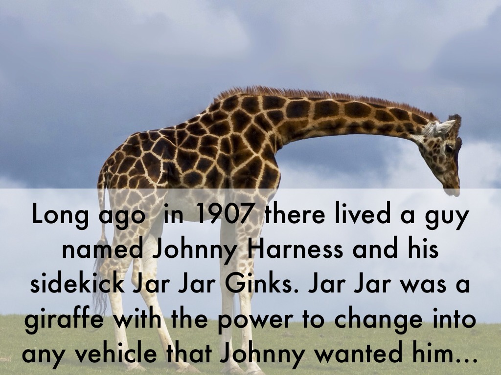 Long ago in 1907 there lived a guy named Johnny Harness and his sidekick Jar Jar Ginks. Jar Jar was a giraffe with the power to change into any vehicle that Johnny wanted him to.