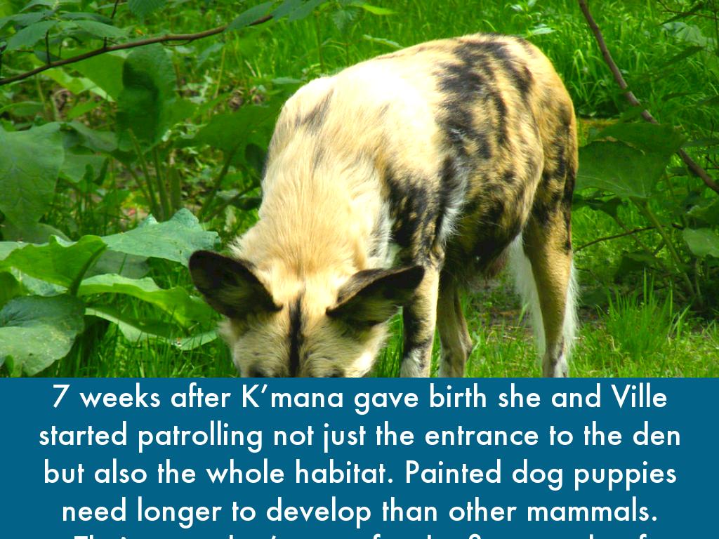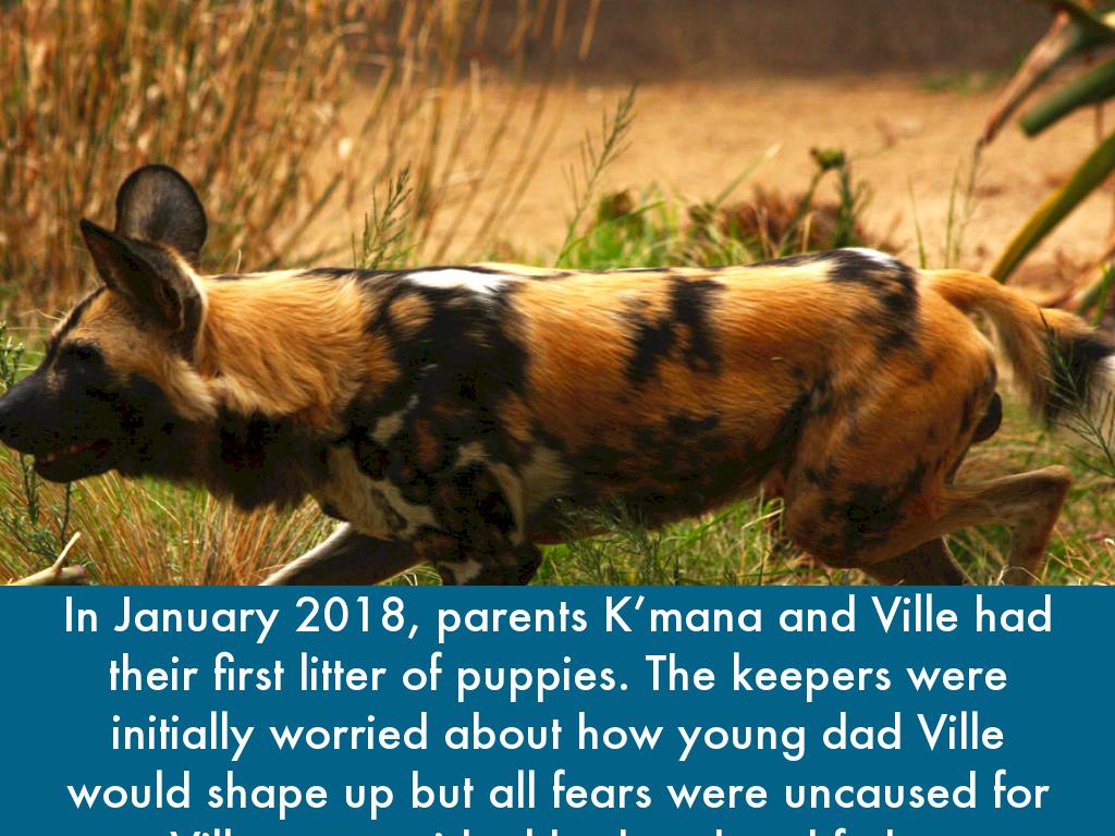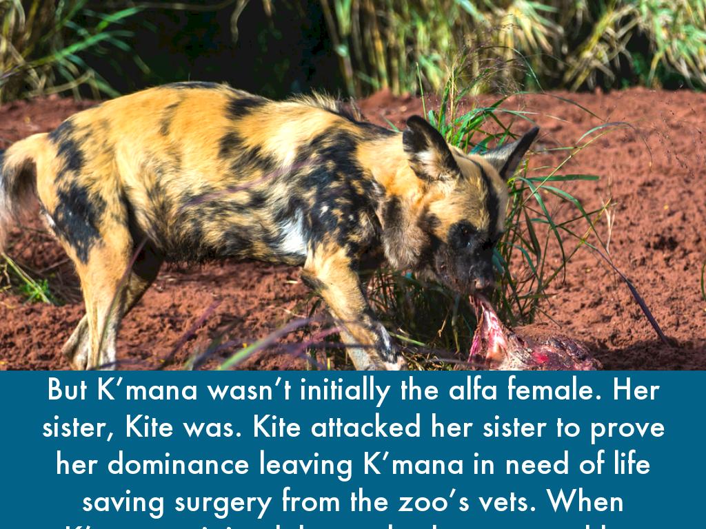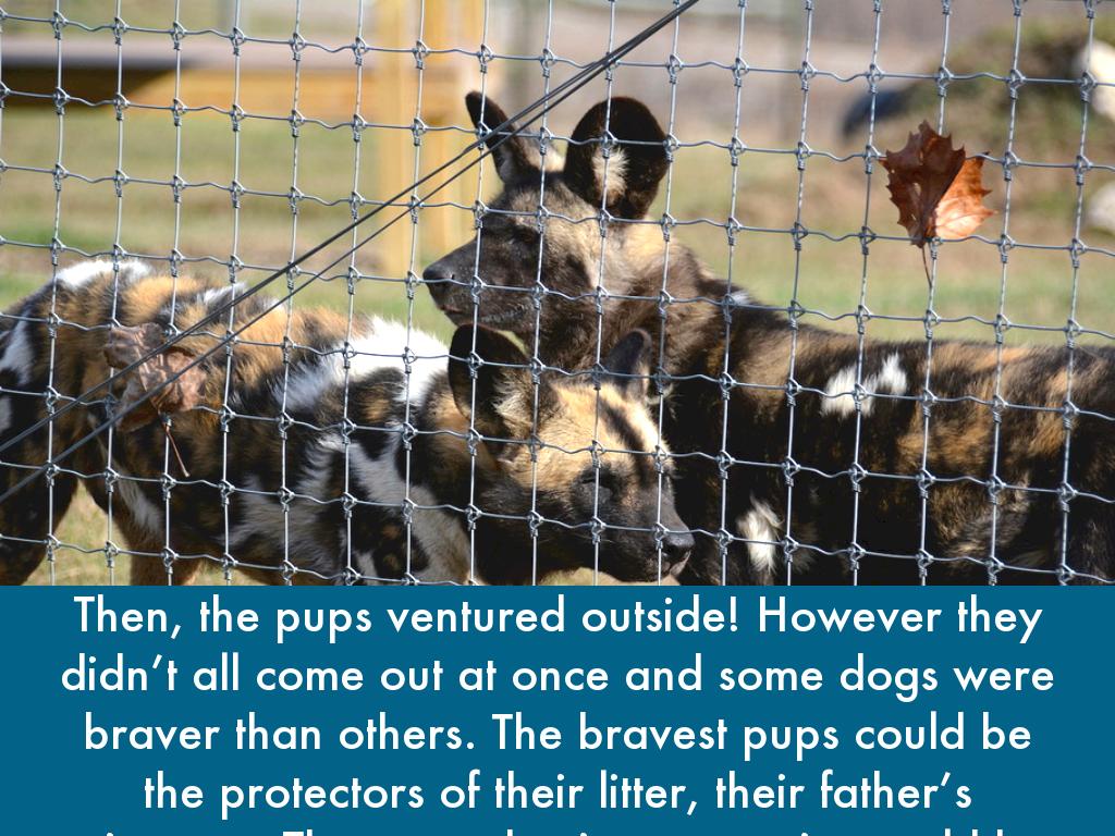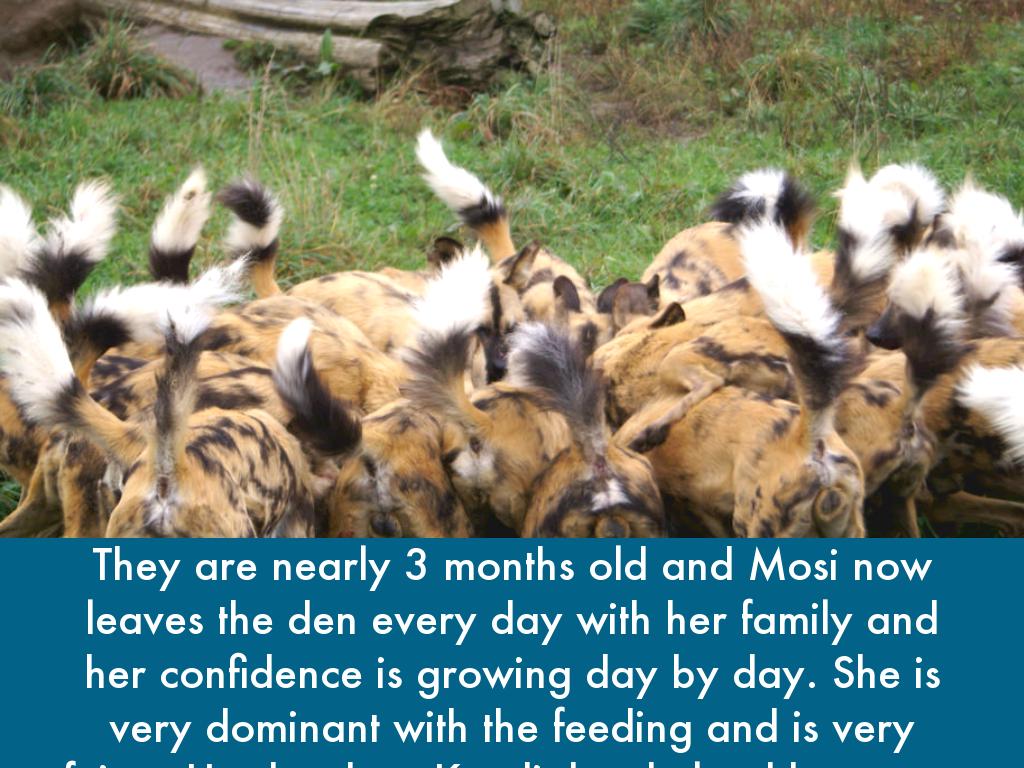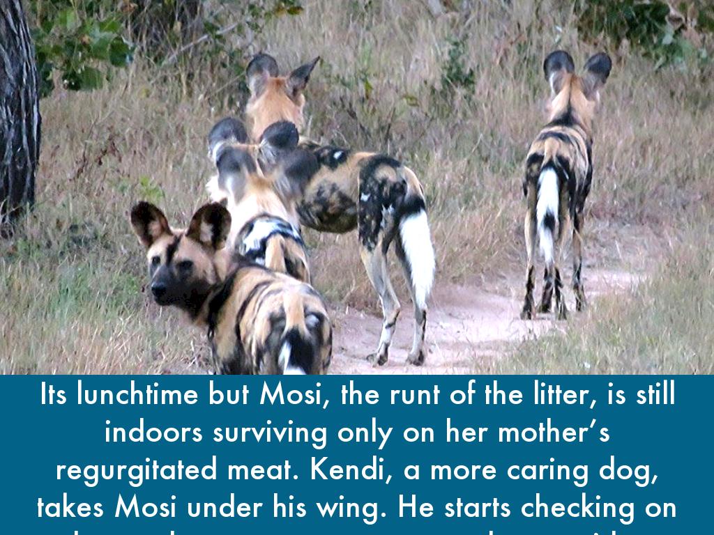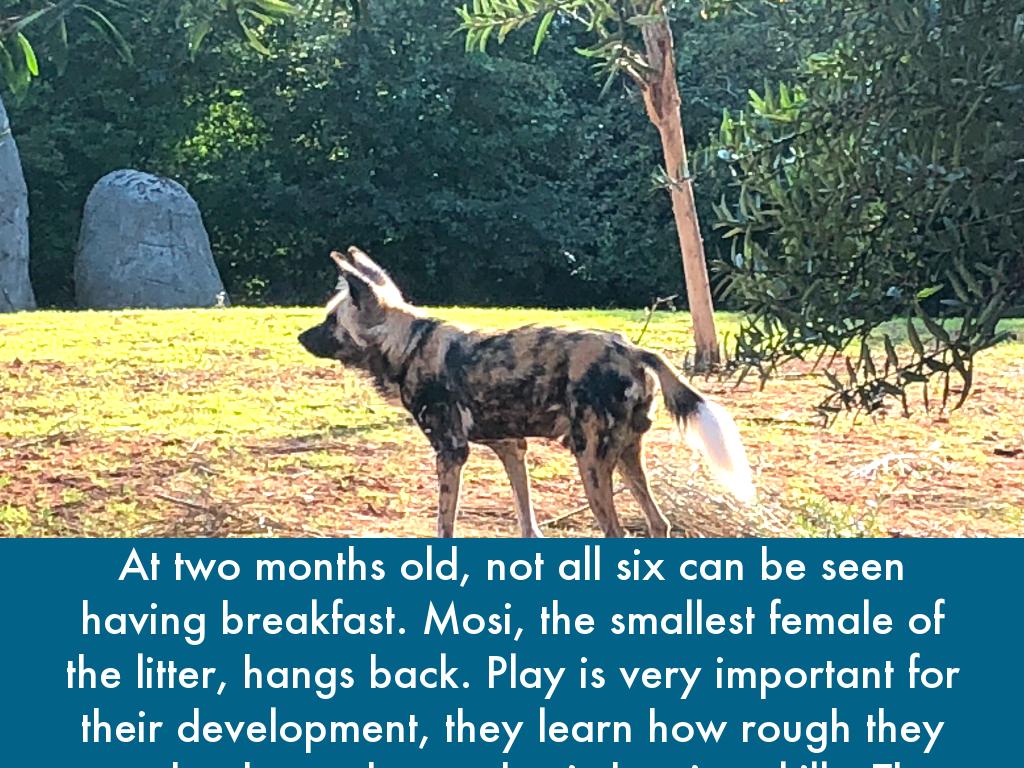 At two months old, not all six can be seen having breakfast. Mosi, the smallest female of the litter, hangs back. Play is very important for their development, they learn how rough they need to be and some basic hunting skills. The longer Mosi stays in the den on her own, the harder to fit in it will be when she eventually leaves. The other pups are eating from the carcus and Mosi will soon become weak with hunger if she doesn’t venture outside soon.