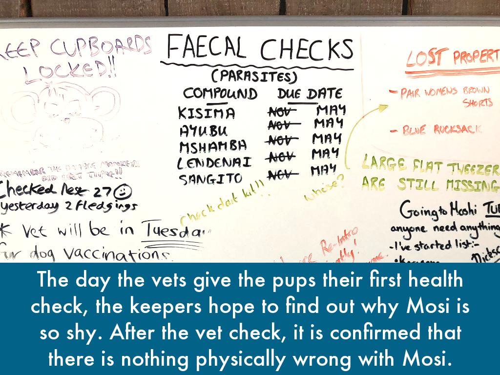 The day the vets give the pups their first health check, the keepers hope to find out why Mosi is so shy. After the vet check, it is confirmed that there is nothing physically wrong with Mosi.