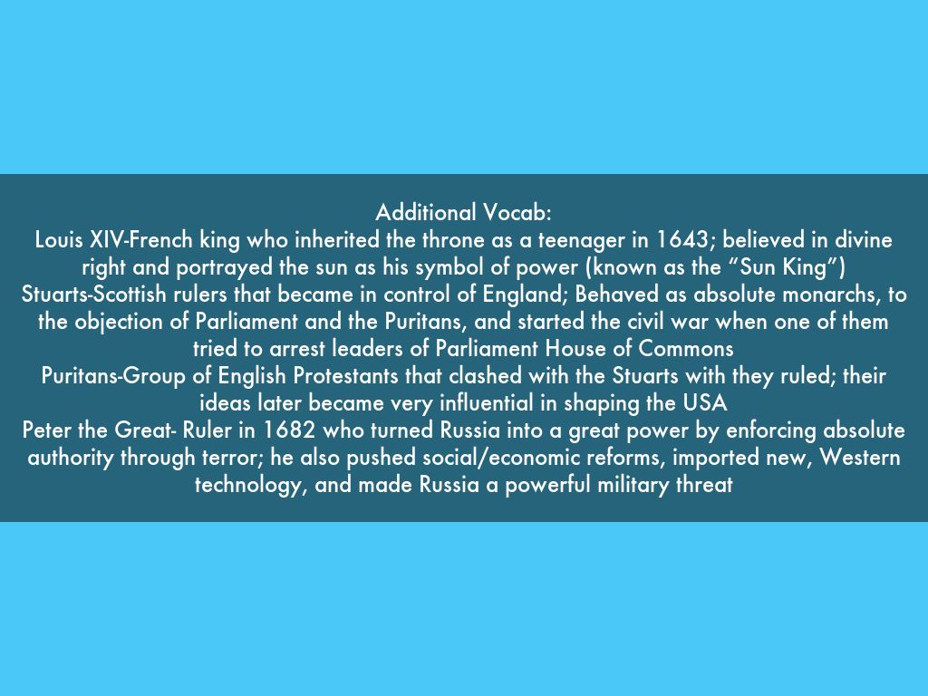 Louis XIV-French king who inherited the throne as a teenager in 1643; believed in divine right and portrayed the sun as his symbol of power (known as the “Sun King”)