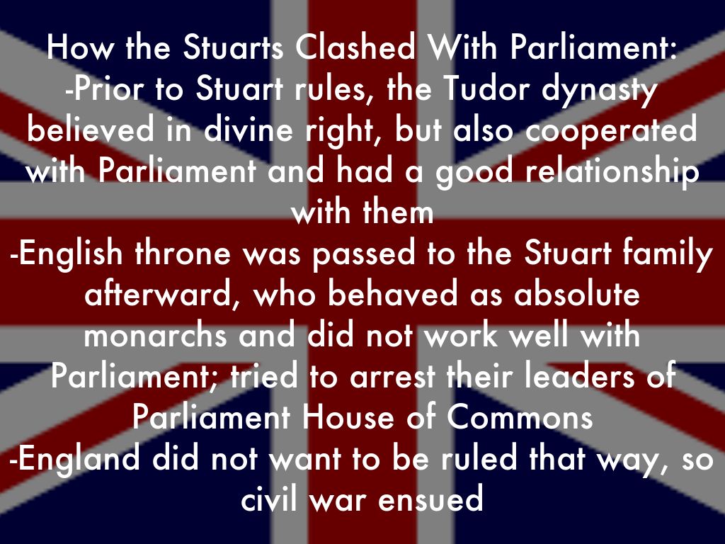 -Prior to Stuart rules, the Tudor dynasty believed in divine right, but also cooperated with Parliament and had a good relationship with them
