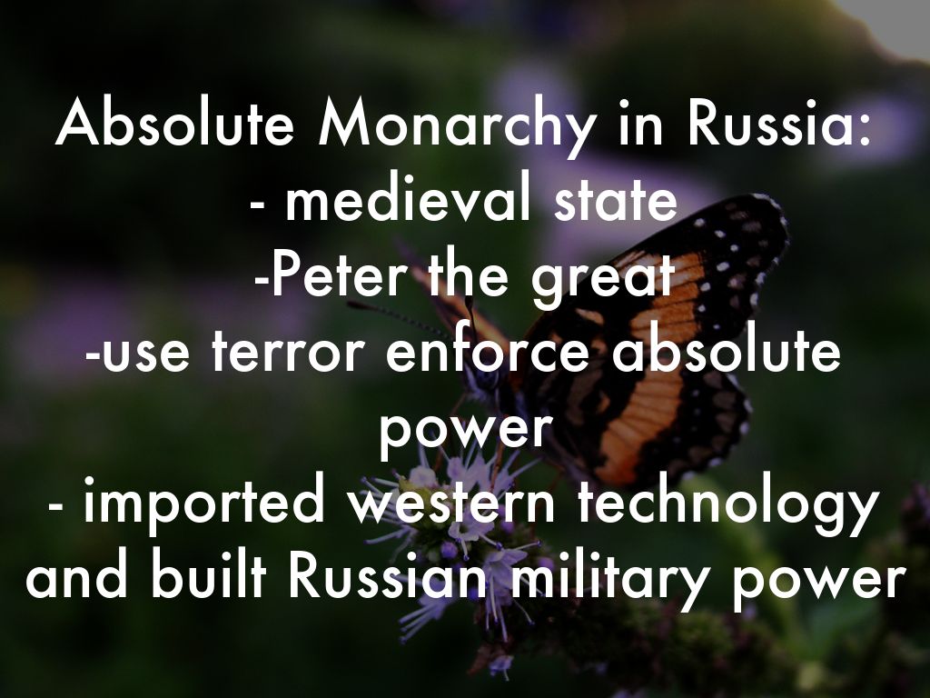 Peter the Great- Ruler in 1682 who turned Russia into a great power by enforcing absolute authority through terror; he also pushed social/economic reforms, imported new, Western technology, and made Russia a powerful military threat