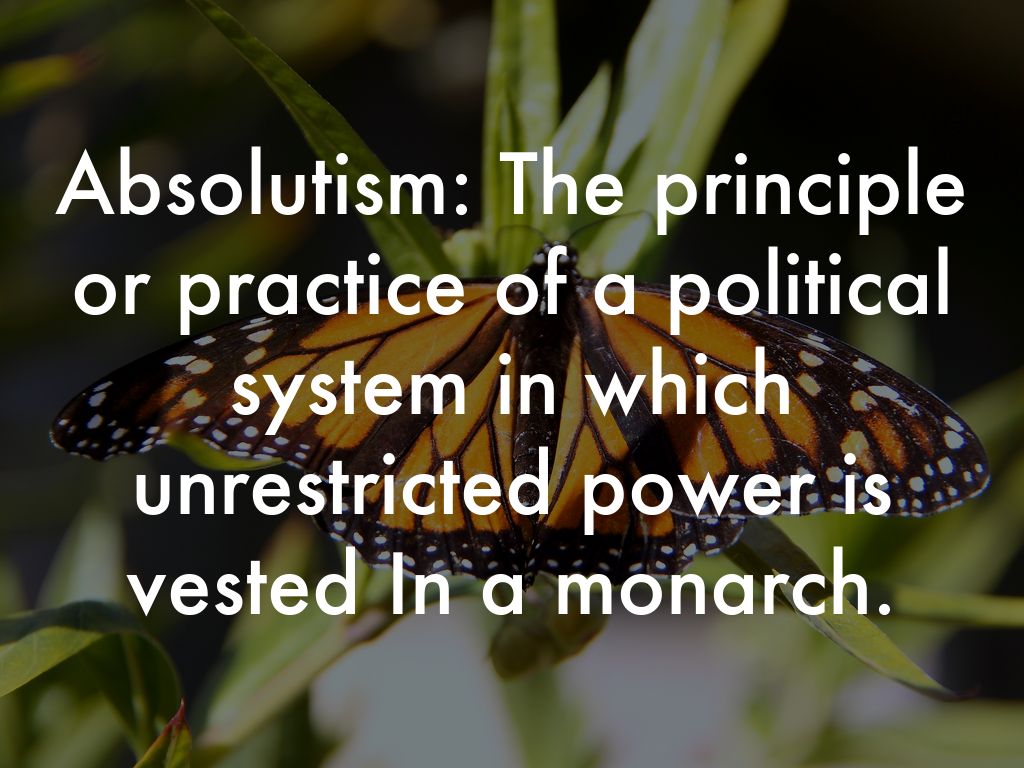 Absolutism: The principle or practice of a political system in which unrestricted power is vested In a monarch.