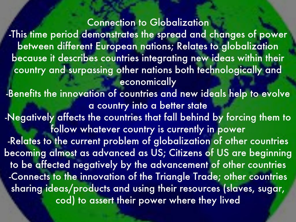 -This time period demonstrates the spread and changes of power between different European nations; Relates to globalization because it describes countries integrating new ideas within their country and surpassing other nations both technologically and economically
