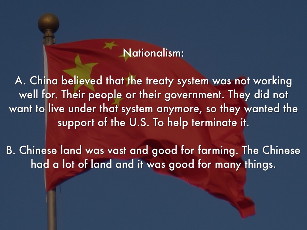 A. China believed that the treaty system was not working well for. Their people or their government. They did not want to live under that system anymore, so they wanted the support of the U.S. To help terminate it.