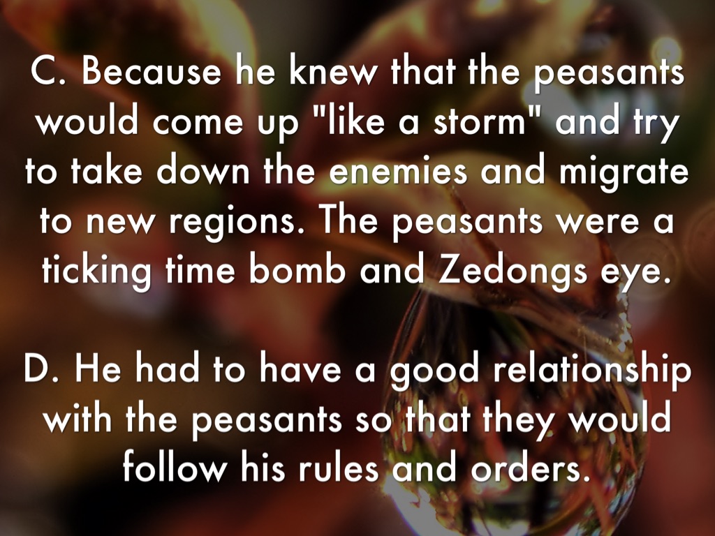 C. Because he knew that the peasants would come up "like a storm" and try to take down the enemies and migrate to new regions. The peasants were a ticking time bomb and Zedongs eye.