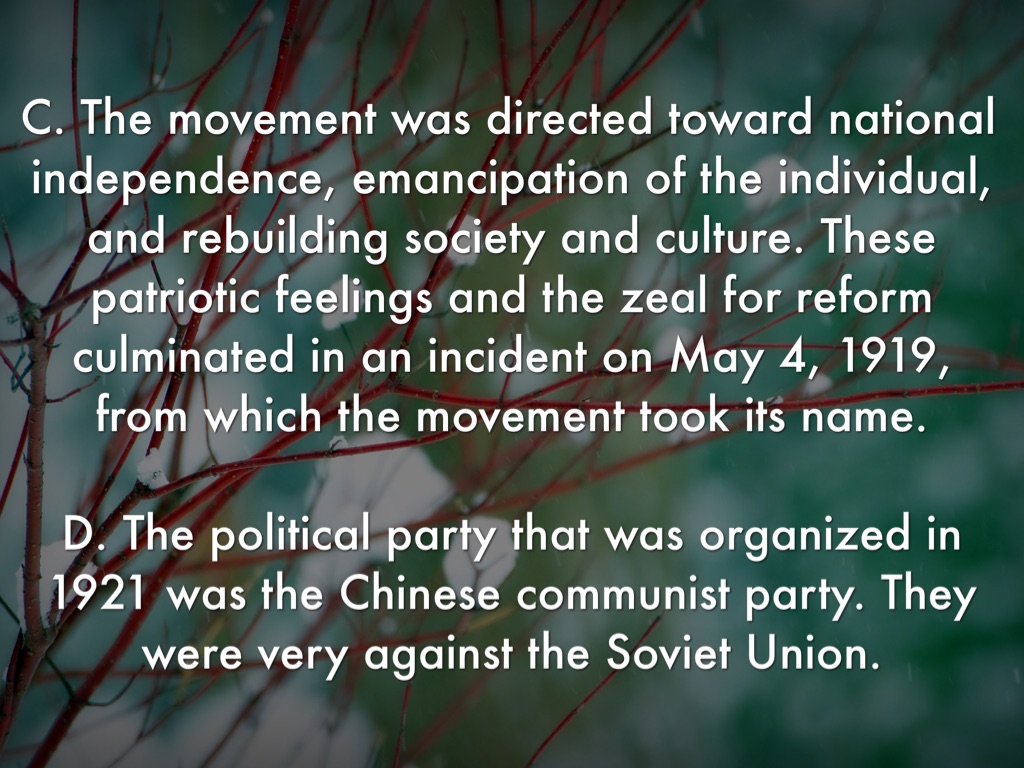 D. The political party that was organized in 1921 was the Chinese communist party. They were very against the Soviet Union.
