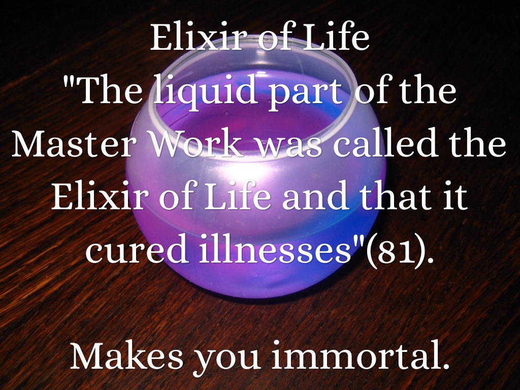 "The liquid part of the Master Work was called the Elixir of Life and that it cured illnesses"(81).