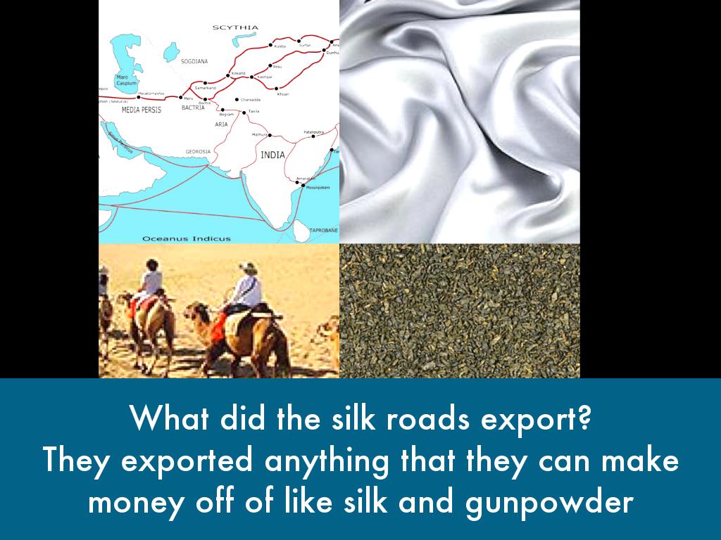 The silk roads were a chain of roads that traders would travel on. Connecting China, Middle East, Europe. Made in the Han Dynasty opened in 130 B.C use until 1453 A.D