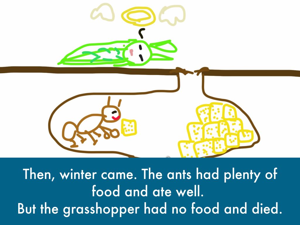 The grasshopper said, “Why are you working so hard? Let’s dance and sing.”