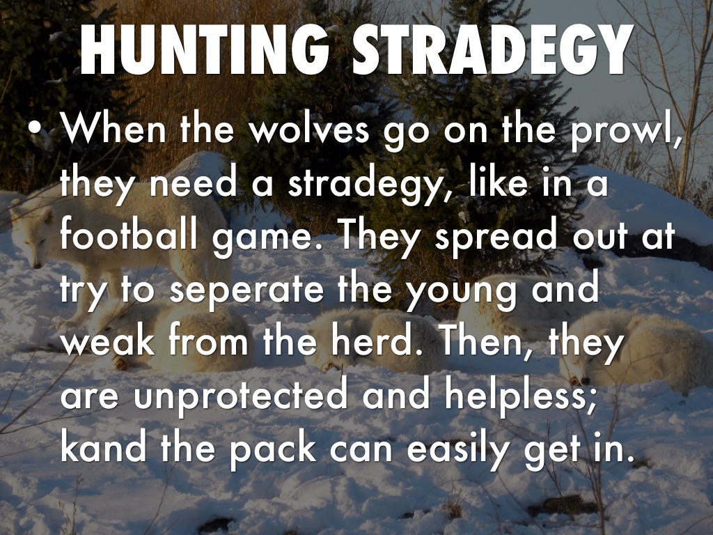 When the wolves go on the prowl, they need a stradegy, like in a football game. They spread out at try to seperate the young and weak from the herd. Then, they are unprotected and helpless; kand the pack can easily get in.