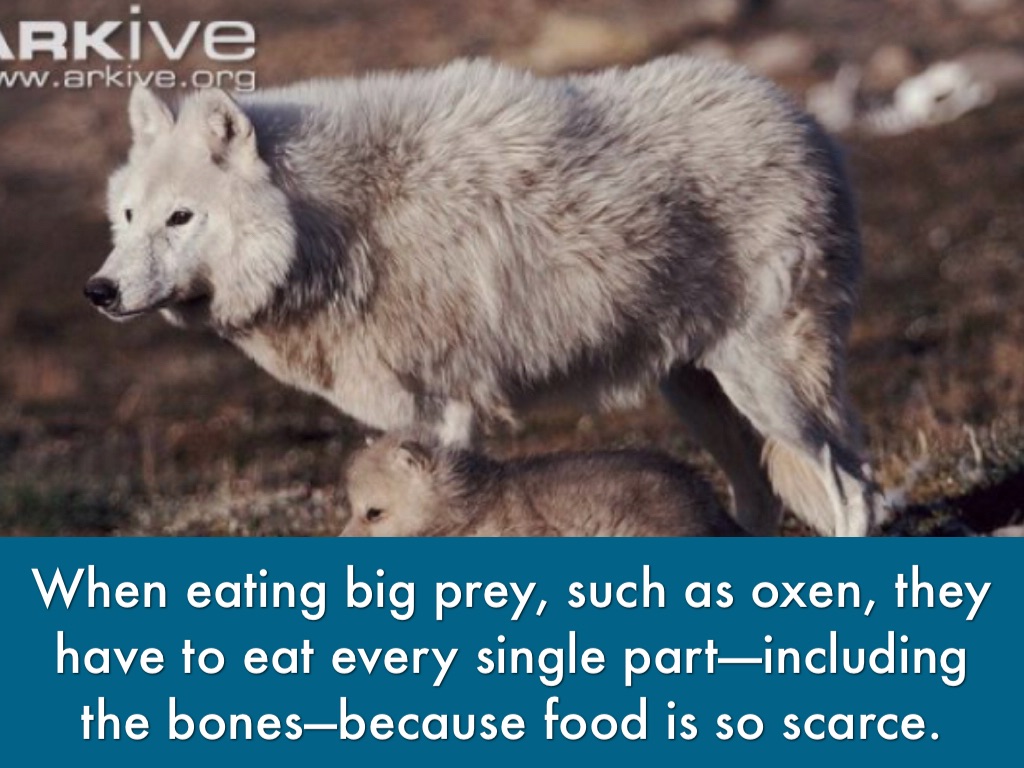 The Arctic wolf's diet mainly consists of lemmings, and arctic hares, but small prey such as these are not very sustainable for this top-of-the-food-chain predator.