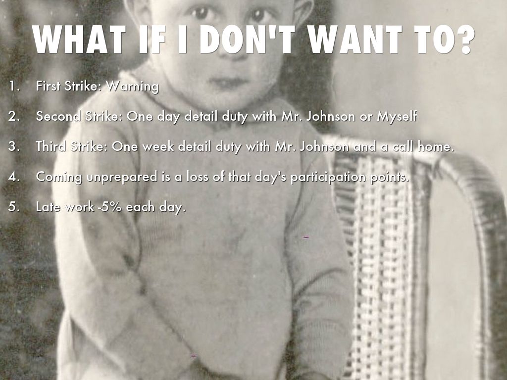 • Third Strike: One week detail duty with Mr. Johnson and a call home.