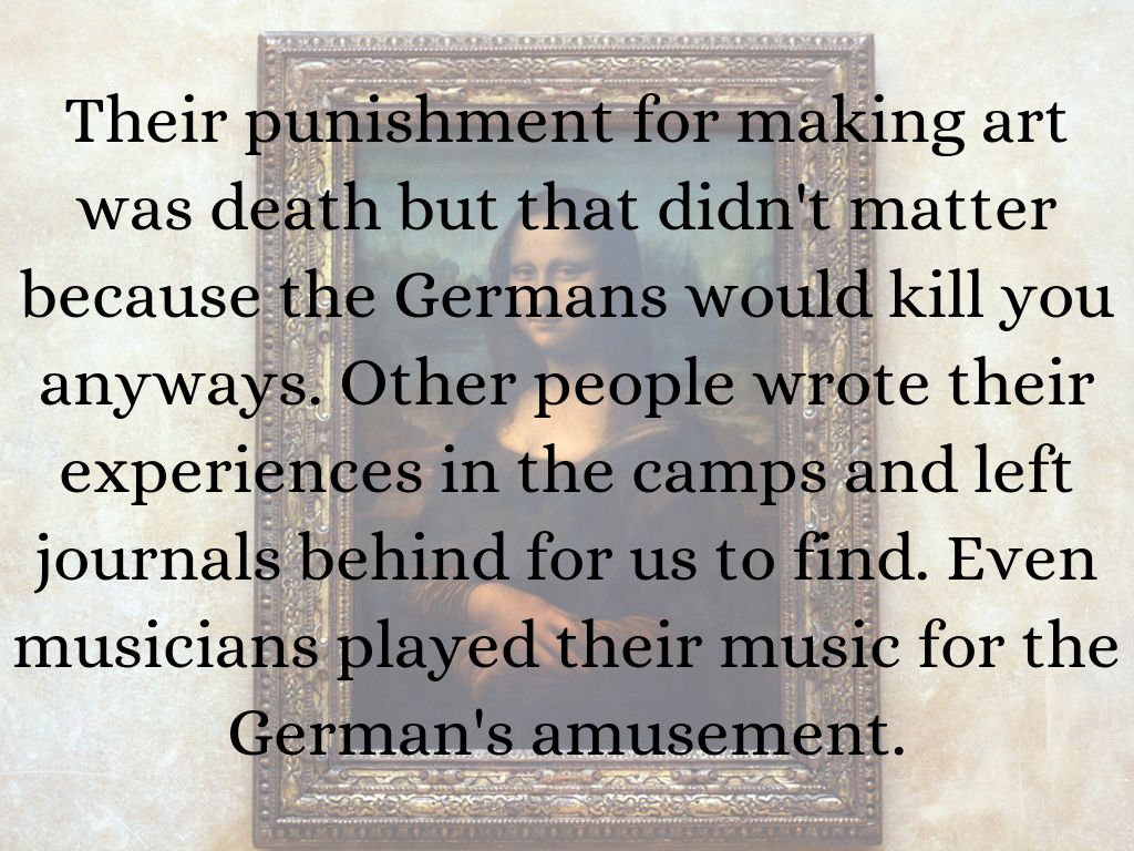 Their punishment for making art was death but that didn't matter because the Germans would kill you anyways. Other people wrote their experiences in the camps and left journals behind for us to find. Even musicians played their music for the German's amusement.