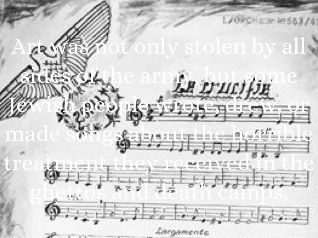 Art was not only stolen by all sides of the army, but some Jewish people wrote, drew, or made songs about the horrible treatment they received in the ghettos and death camps.