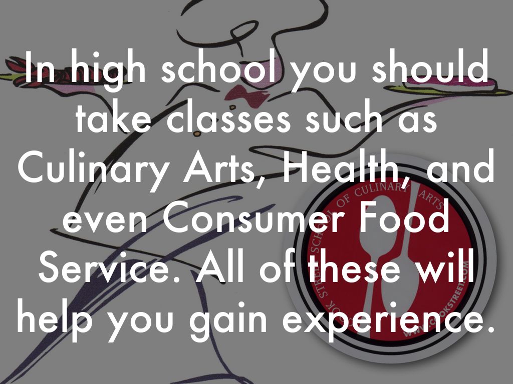 In high school you should take classes such as Culinary Arts, Health, and even Consumer Food Service. All of these will help you gain experience.