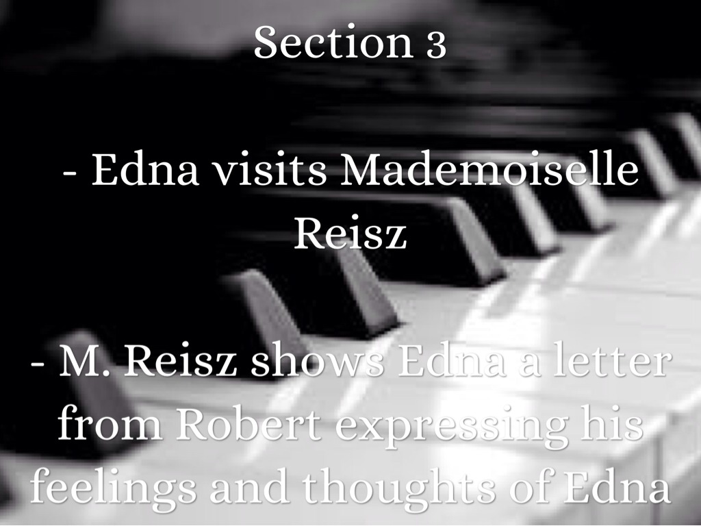 - M. Reisz shows Edna a letter from Robert expressing his feelings and thoughts of Edna