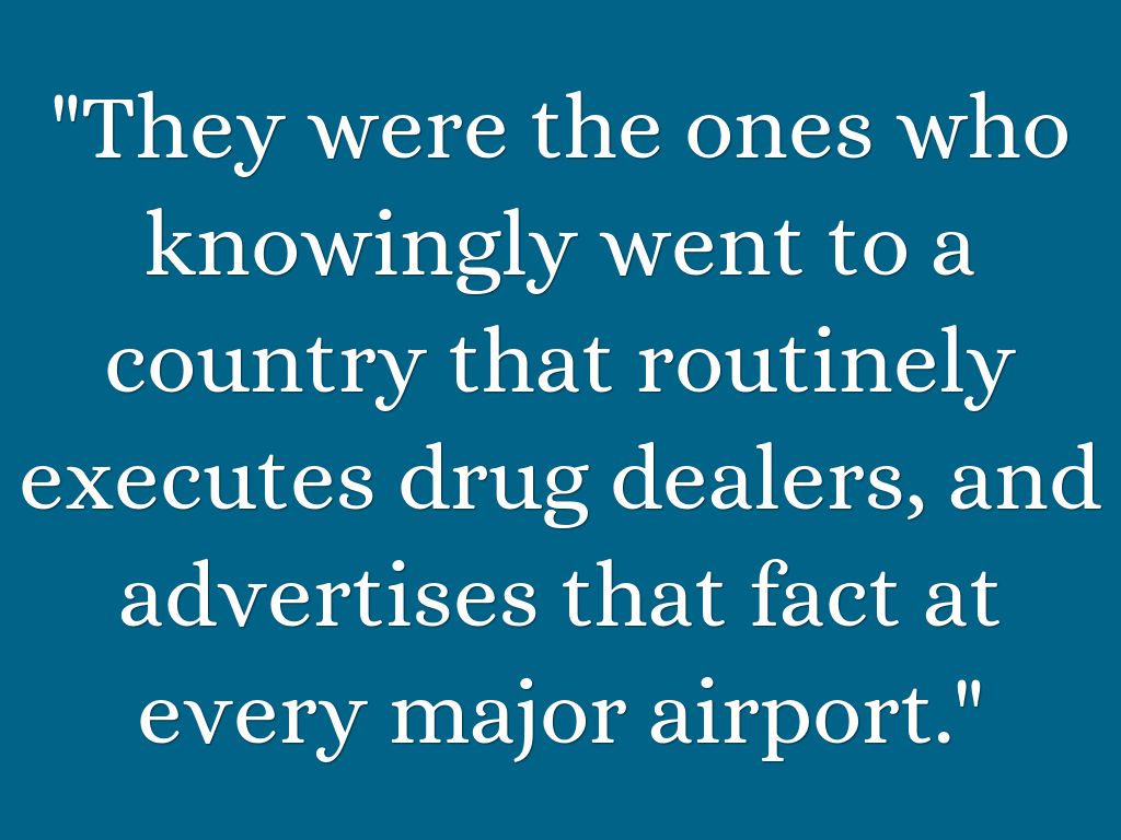 "They were the ones who knowingly went to a country that routinely executes drug dealers, and advertises that fact at every major airport."