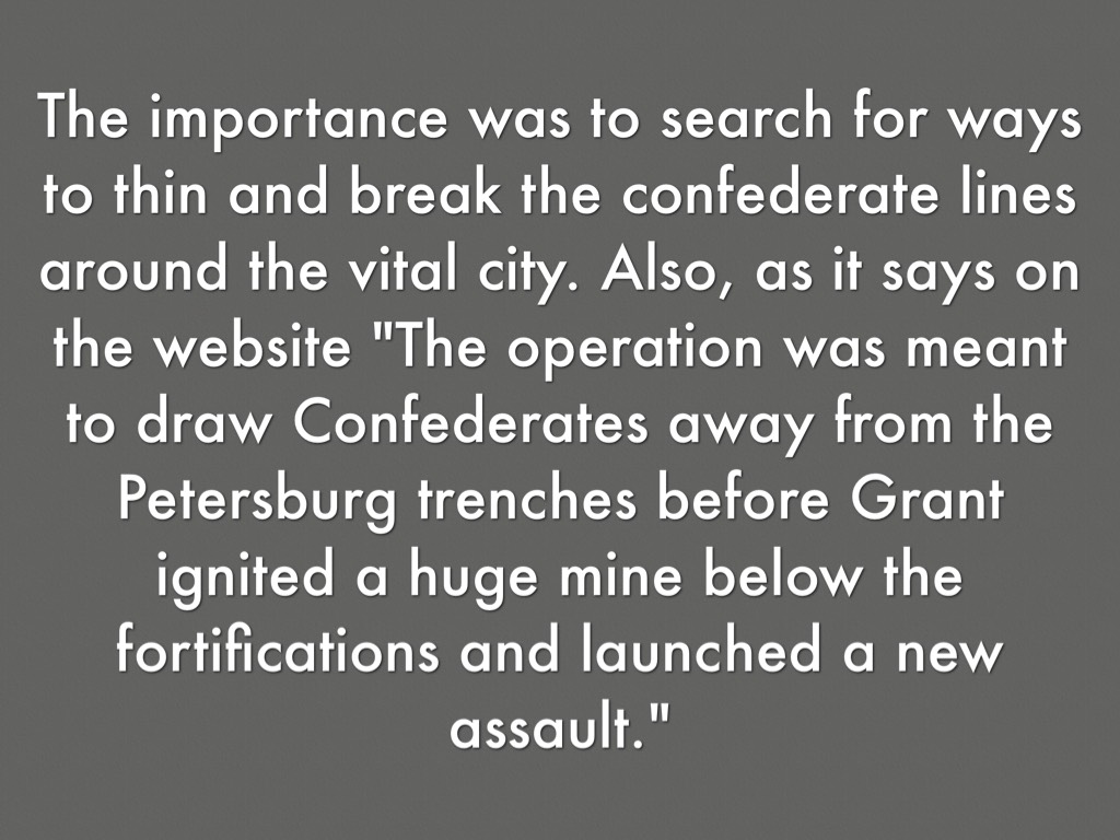 The importance was to search for ways to thin and break the confederate lines around the vital city. Also, as it says on the website "The operation was meant to draw Confederates away from the Petersburg trenches before Grant ignited a huge mine below the fortifications and launched a new assault."