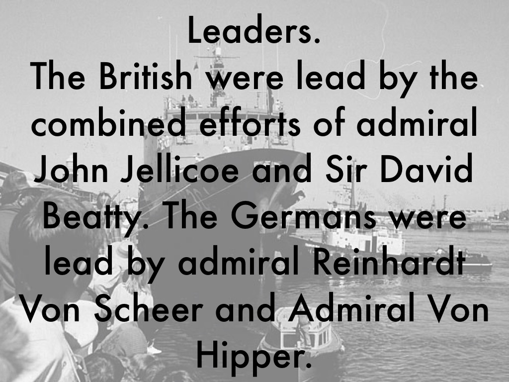The British were lead by the combined efforts of admiral John Jellicoe and Sir David Beatty. The Germans were lead by admiral Reinhardt Von Scheer and Admiral Von Hipper.