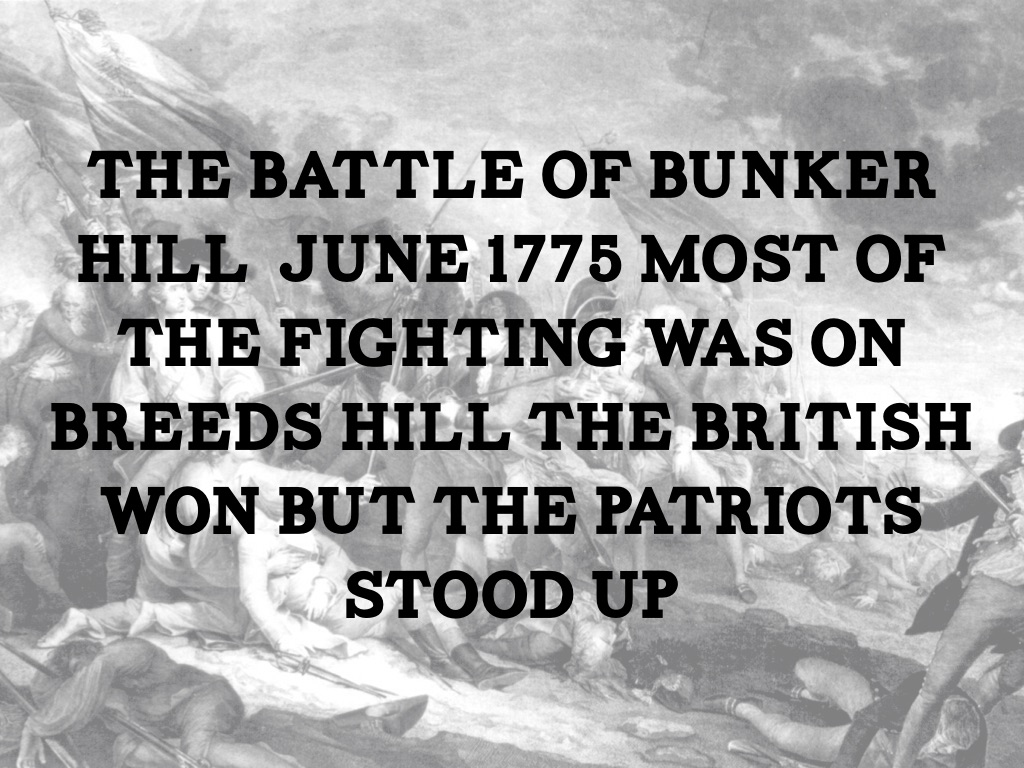 The battle of bunker hill June 1775 most of the fighting was on breeds hill the British won but the patriots stood up
