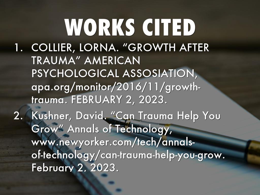 The article “Can Trauma Help You Grow” by David Kushner, has an impact quote that is very important in terms of how humans function after severe events. He writes, “There’s something built-in that enable most human being, not all, but most to get thru, force us, to survive, to stay alive.” The quote is very important because humans are resilient creatures that adapt to situations and will do anything to survive. This could be applied to trauma, if one undergoes trauma and wants to continue forward one must not look at the terrible past and dwell on it, they must look at that past and accept that it happened then move forward and grow.