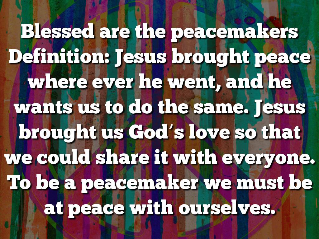 Blessed are the peacemakers Definition: Jesus brought peace where ever he went, and he wants us to do the same. Jesus brought us God’s love so that we could share it with everyone. To be a peacemaker we must be at peace with ourselves.