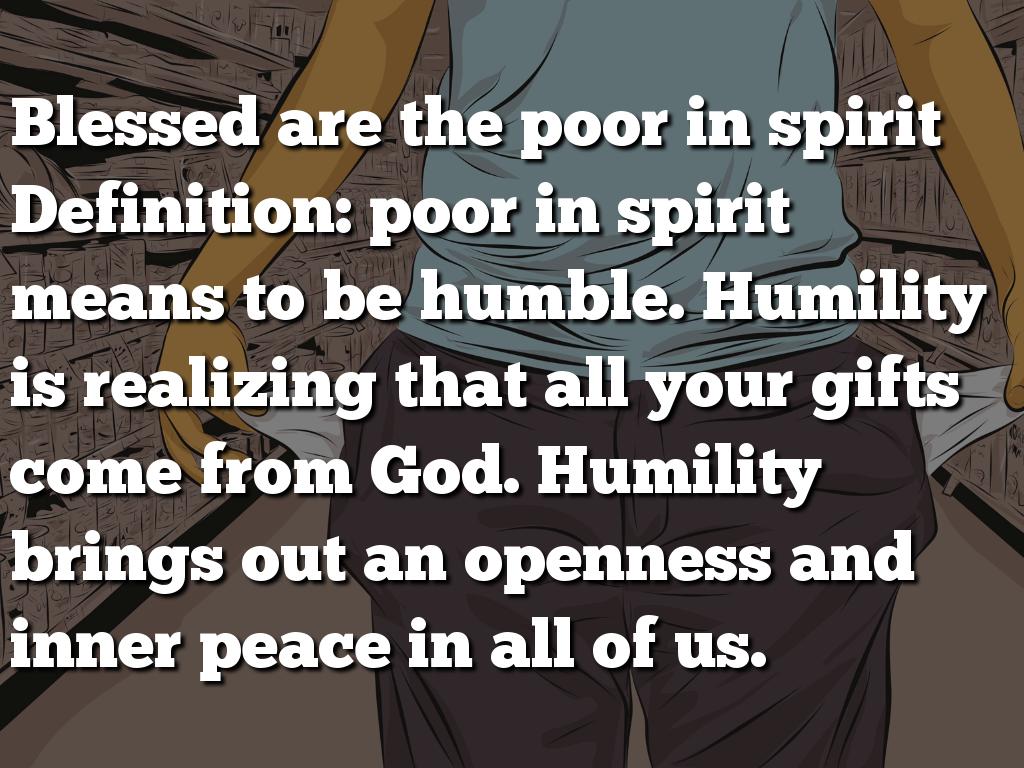 Blessed are the poor in spirit Definition: poor in spirit means to be humble. Humility is realizing that all your gifts come from God. Humility brings out an openness and inner peace in all of us.