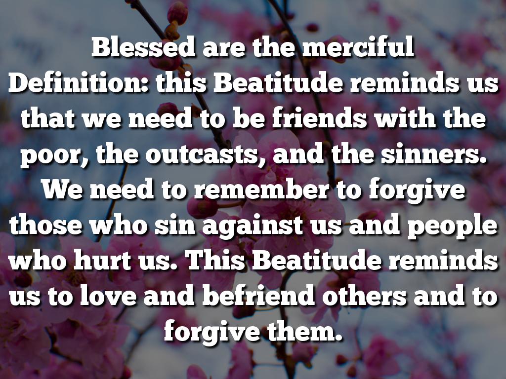 Blessed are the merciful Definition: this Beatitude reminds us that we need to be friends with the poor, the outcasts, and the sinners. We need to remember to forgive those who sin against us and people who hurt us. This Beatitude reminds us to love and befriend others and to forgive them.