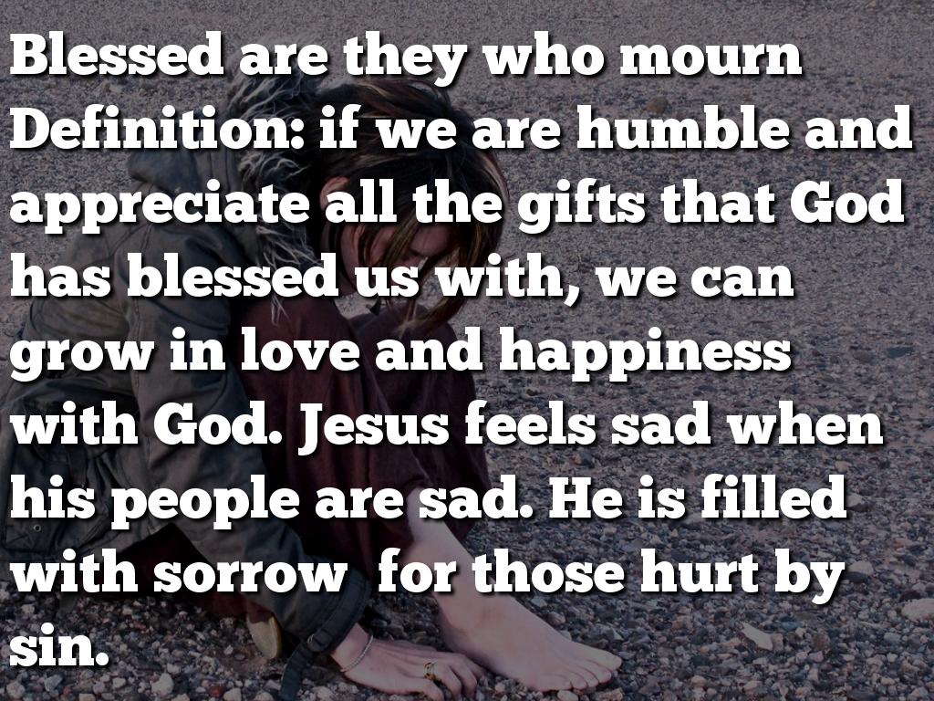 Blessed are they who mourn Definition: if we are humble and appreciate all the gifts that God has blessed us with, we can grow in love and happiness with God. Jesus feels sad when his people are sad. He is filled with sorrow for those hurt by sin.